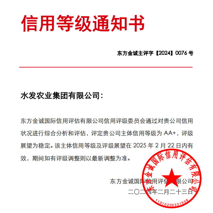 水發(fā)農(nóng)業(yè)集團(tuán)榮獲AA+主體信用評(píng)級(jí)
